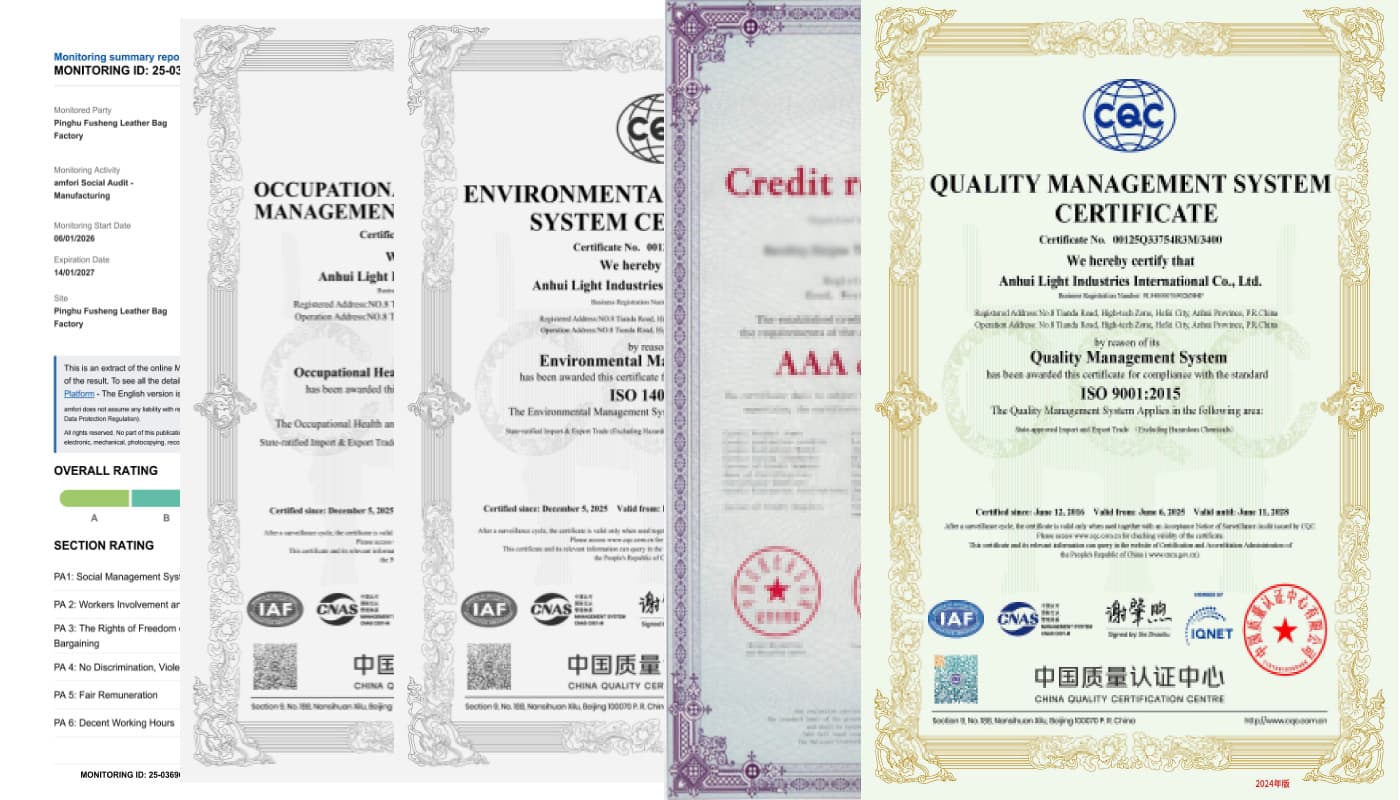 Como fabricante de bolsas OEM y ODM de confianza, Zabaggo opera en pleno cumplimiento de las normas de gestión de calidad ISO y las certificaciones de responsabilidad social BSCI. Estos estándares reconocidos a nivel mundial subrayan nuestro firme compromiso con la calidad constante y fiable de nuestros productos, así como con prácticas de producción éticas y sostenibles en todas nuestras operaciones de fabricación de bolsas.