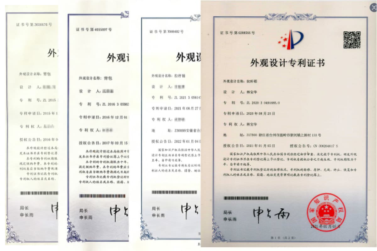 Zabaggo posee varias patentes nacionales autorizadas para bolsos y maletas, que abarcan el diseño estructural, la innovación funcional, el estilo estético y la aplicación de materiales duraderos. Estas patentes exclusivas reflejan nuestra sólida capacidad de I+D y nuestra profesionalidad técnica en la industria de la fabricación de equipaje.